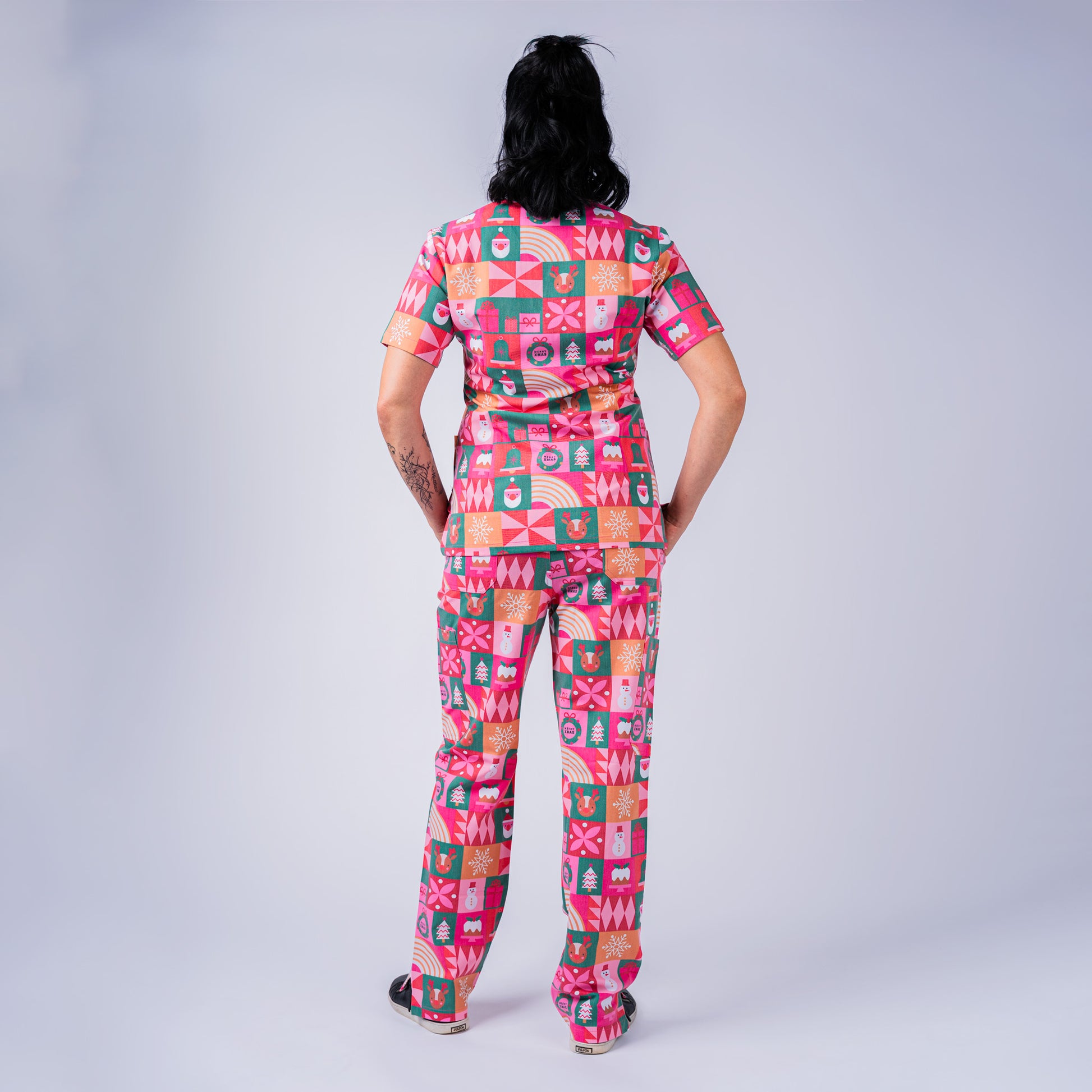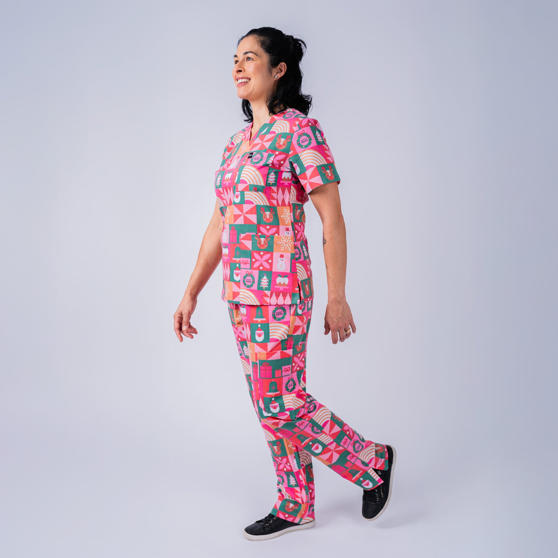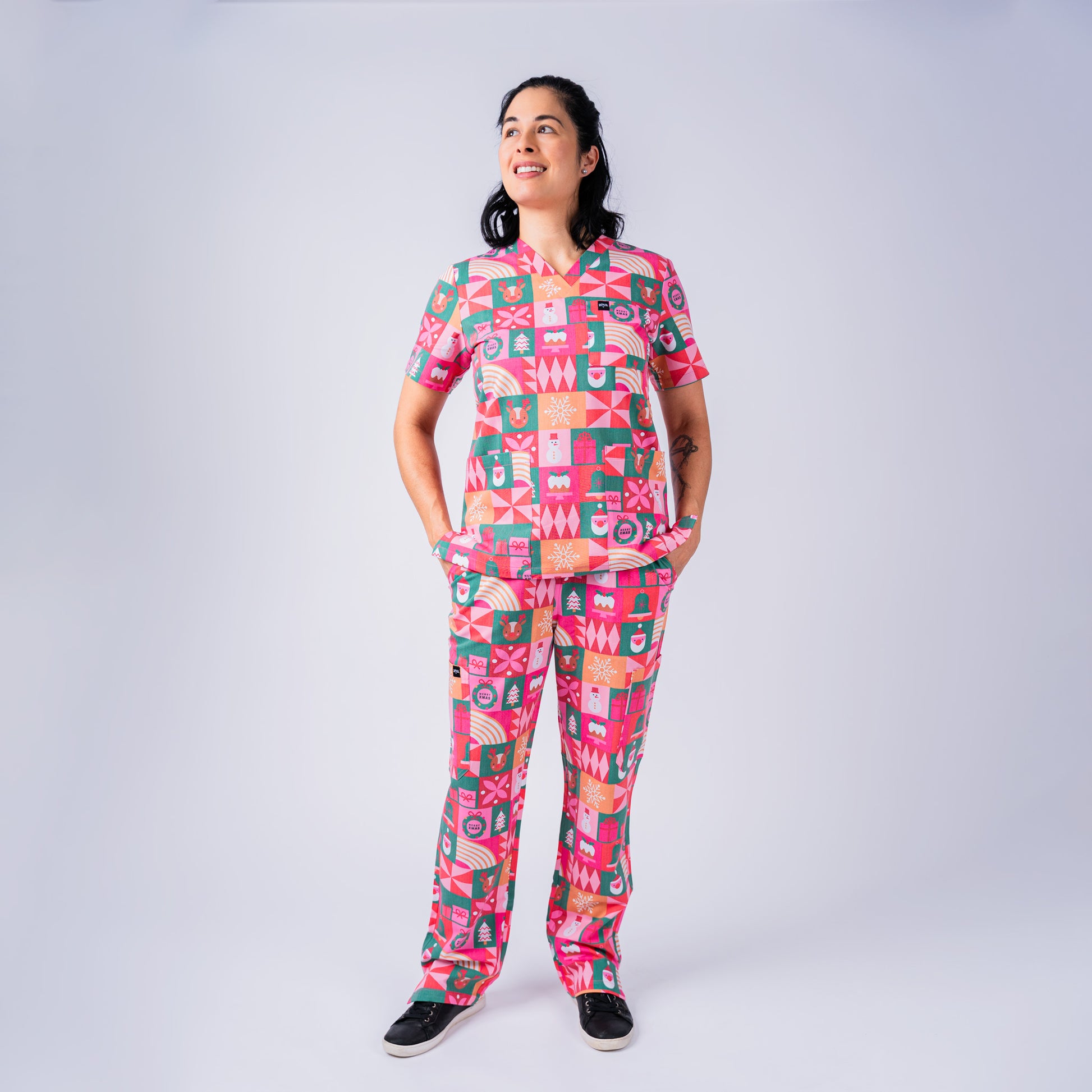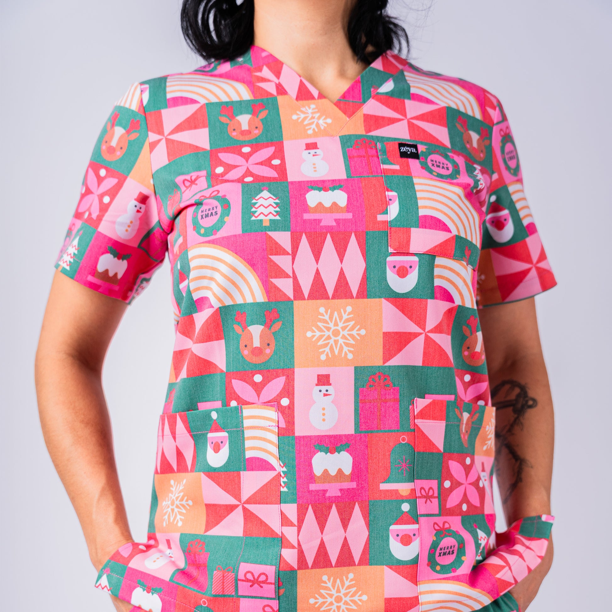 Bring the holiday cheer straight to the ward in the Gift Wrapped Scrub Set—a vibrant blend of peppermint pinks, tree-top greens, and golden gingerbread warmth. With playful patchwork icons and a bold colour pop, this set is made for nurses who aren’t afraid to deck the halls (and the halls of the hospital).
