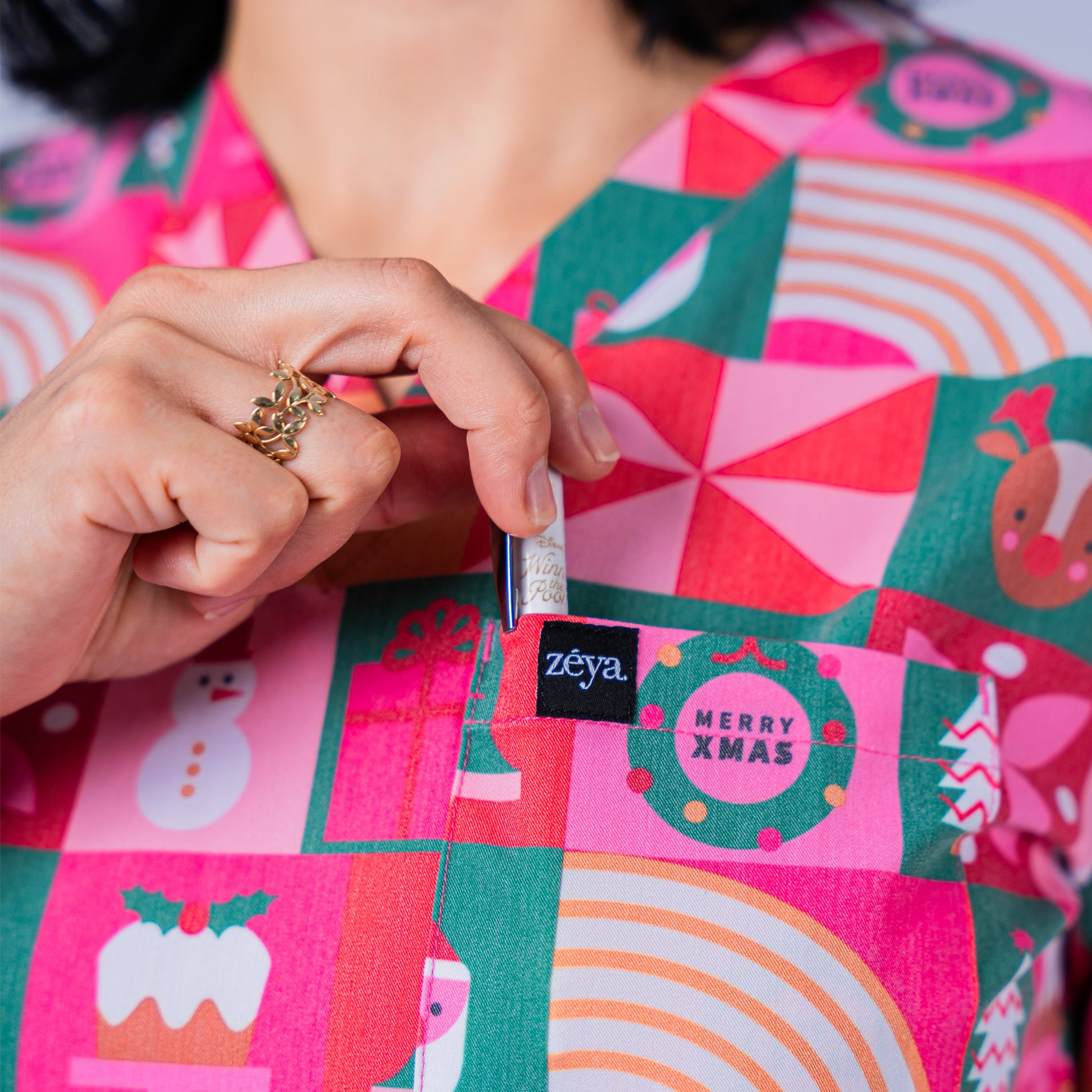 Crafted from Zeya’s signature soft-stretch fabric, it moves with you from back-to-back shifts to breakroom banter. Whether you’re handing out meds or festive vibes, you’ll feel as good as you look.