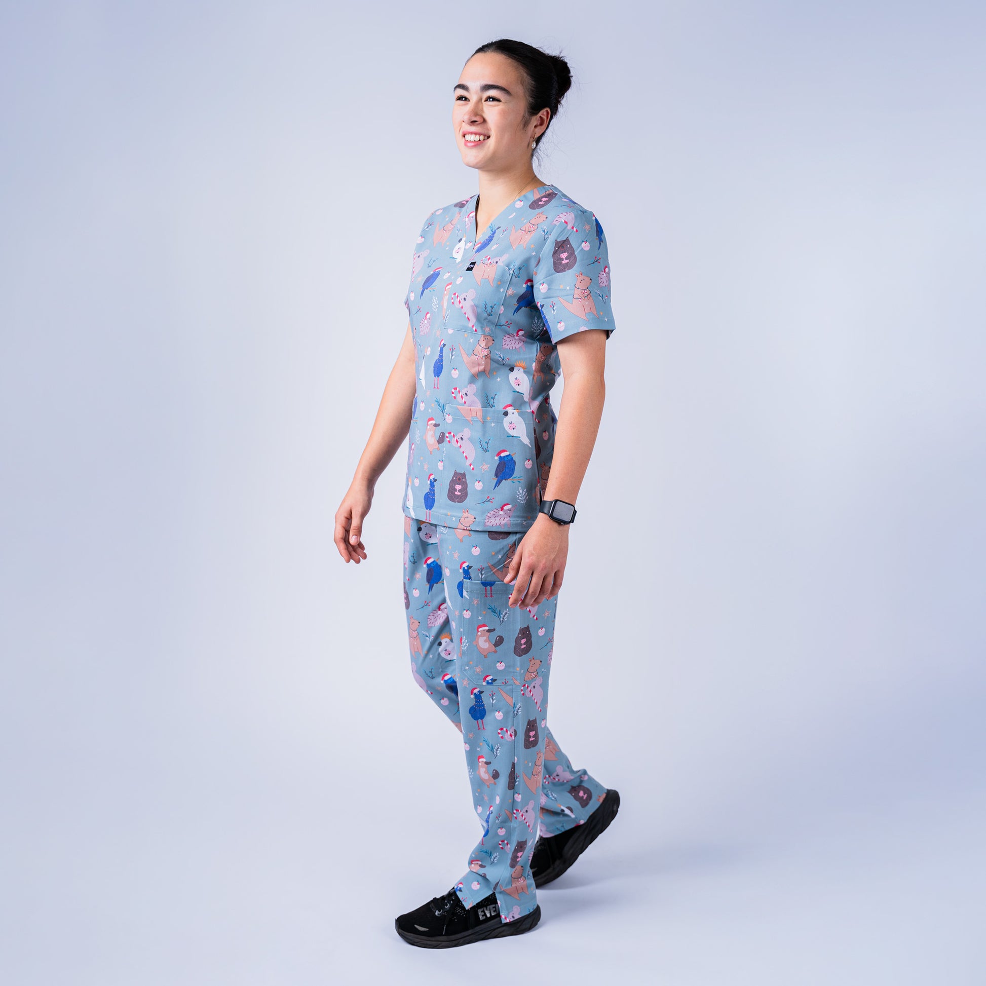This one’s for the nurses who rep Christmas the Aussie way—gum trees instead of pine, kookaburras over carols, and native wildlife in place of reindeer. The Native Christmas Scrub Set blends soft eucalyptus green with adorable hand-drawn koalas, wombats, echidnas, kookaburras and festive bush florals—making it the ultimate nod to a warm, local Christmas.