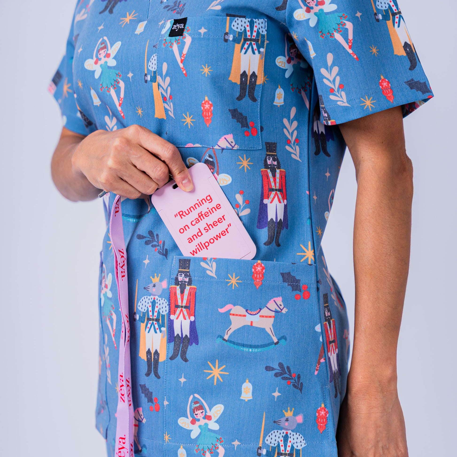 Step into the spotlight this season with The Nutcracker Scrub Set—a festive fairytale brought to life in scrub form. Featuring classic nutcrackers, sugar plum ballerinas, rocking horses, and stars dancing across a rich dusty blue canvas, this set brings a touch of magic to even the most chaotic shift.